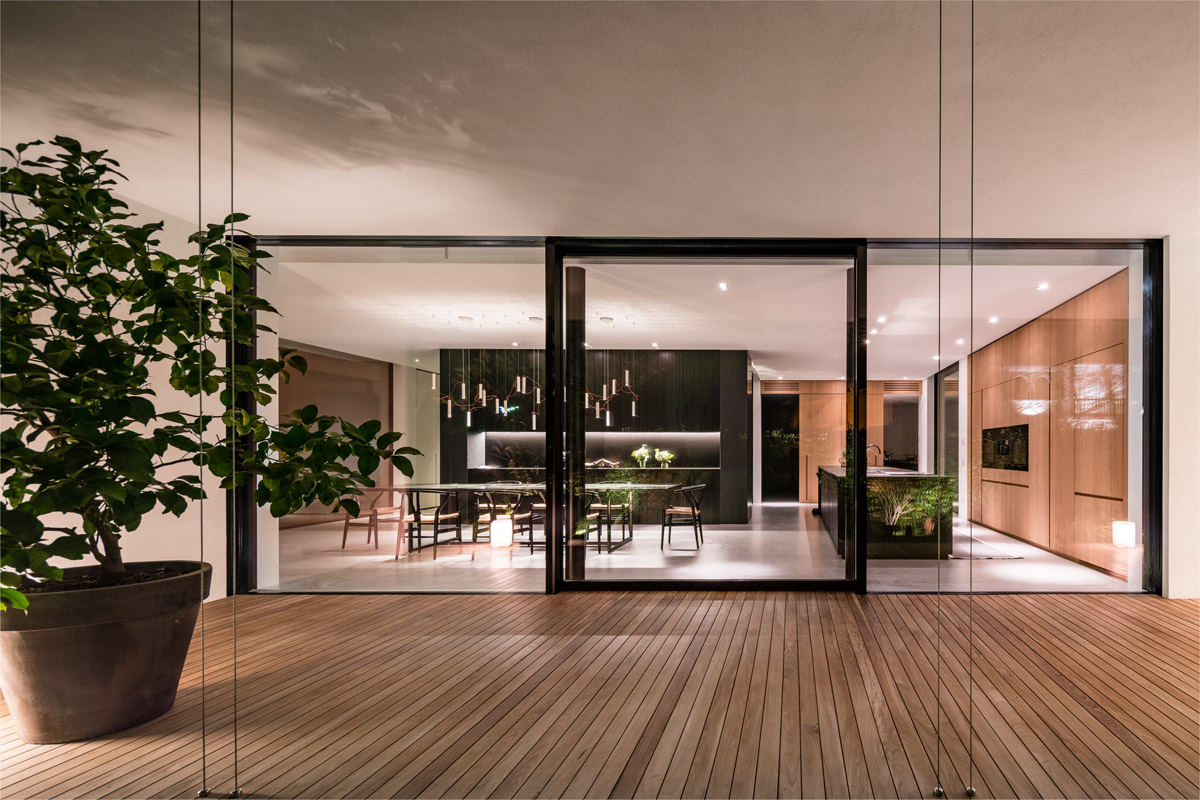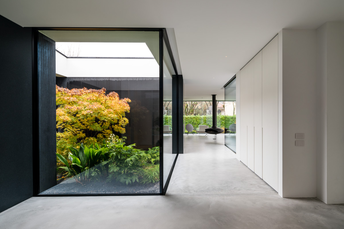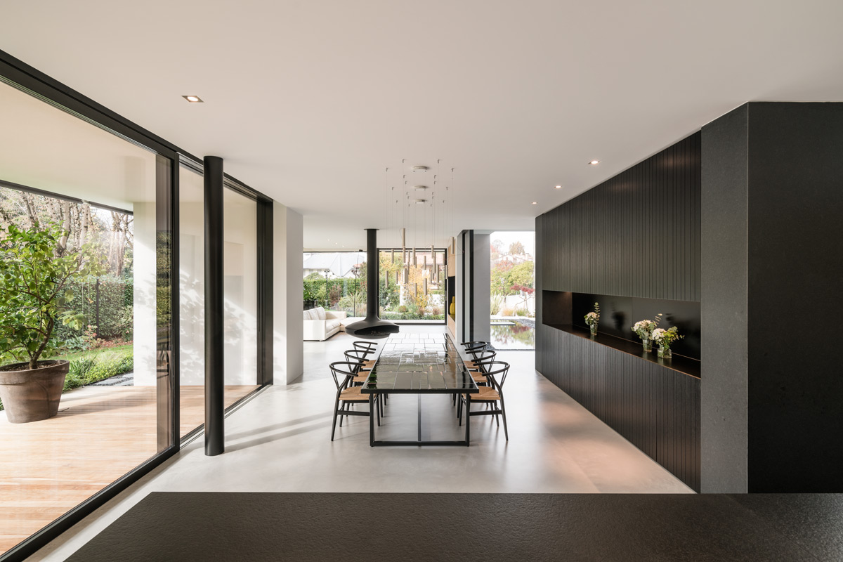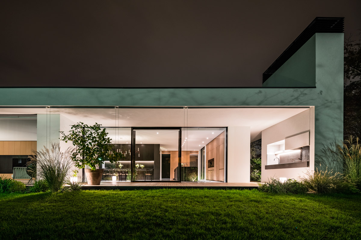 Lo stretto abbraccio tra la vita quotidiana all’interno dell’abitazione e gli accenti verdi e luminosi provenienti dall’esterno crea un ambiente armonioso, dall’atmosfera serena.
