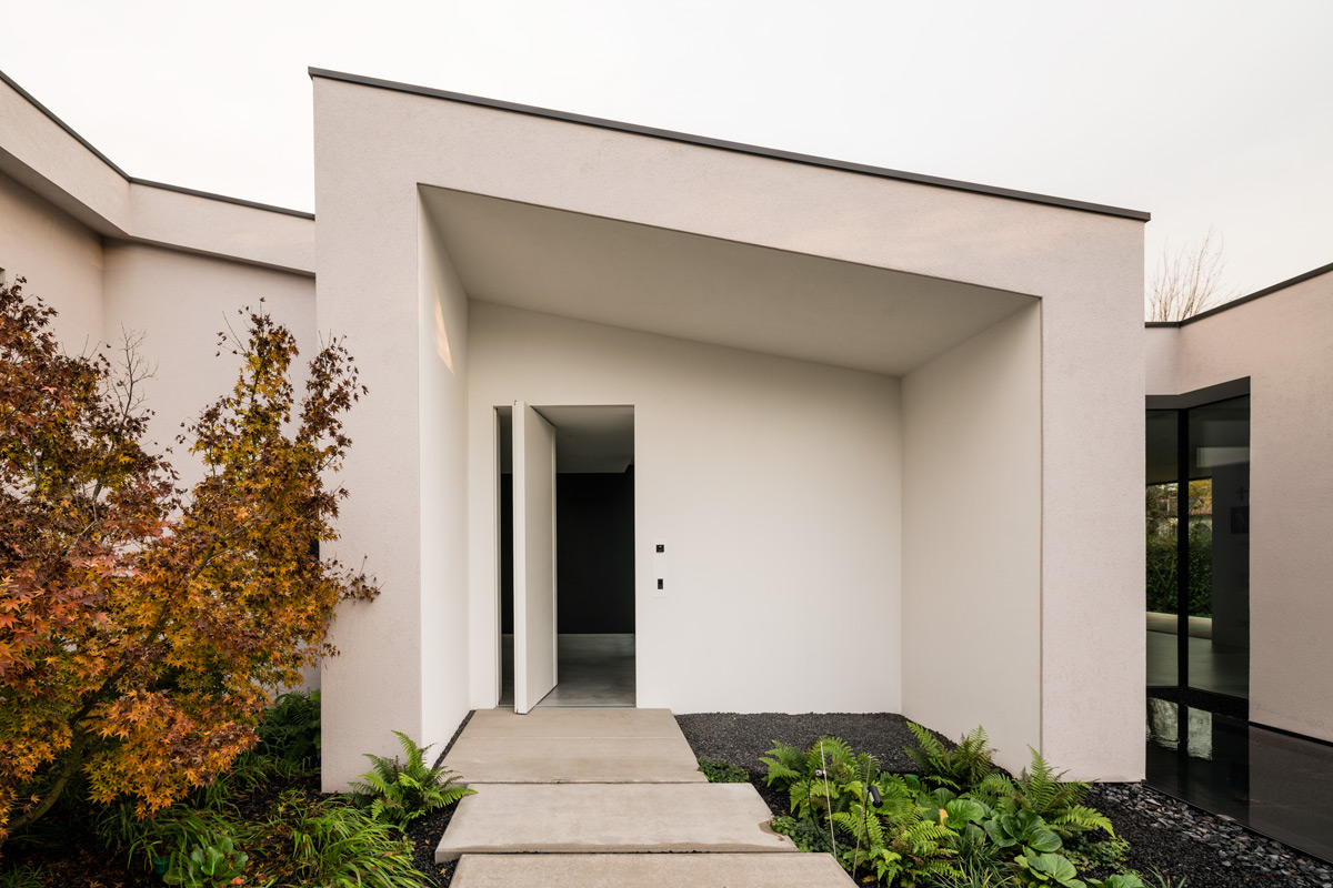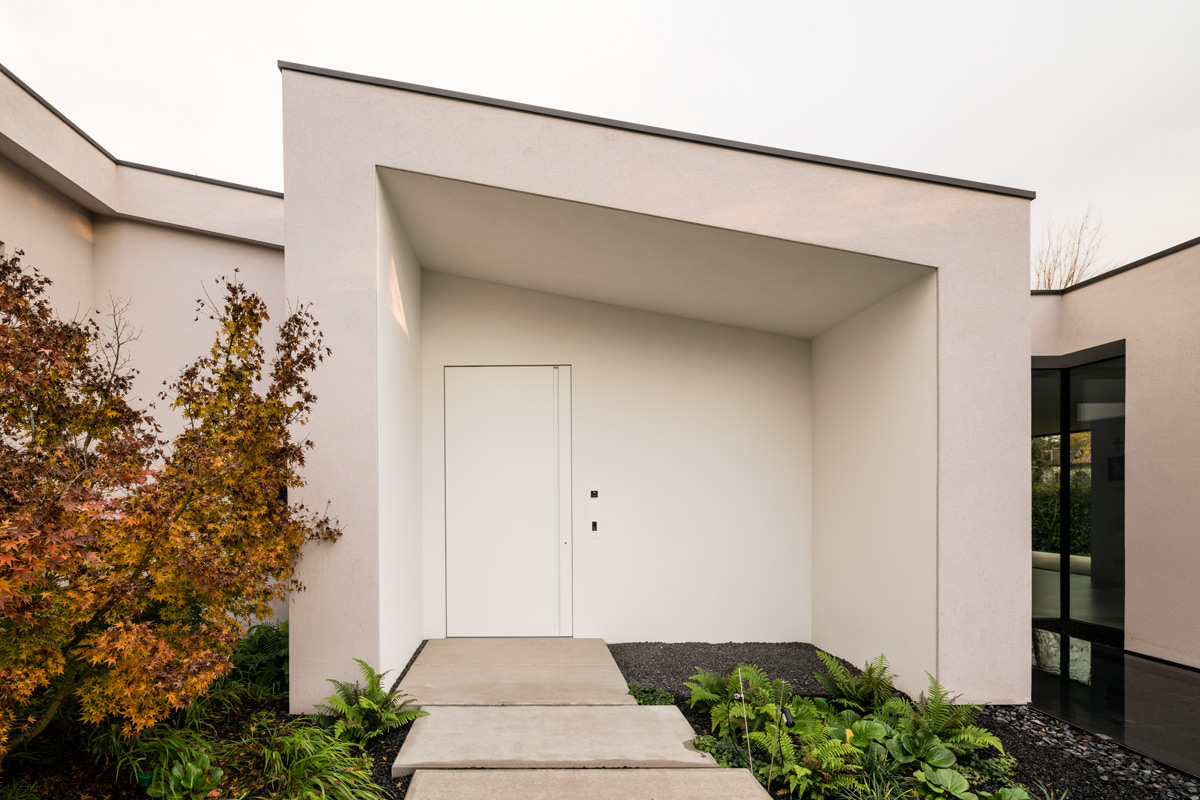 • Porta d’ingresso Arx a risparmio energetico con apertura a pivot, maniglione Total a tutta altezza e installazione a filo-muro esterno.