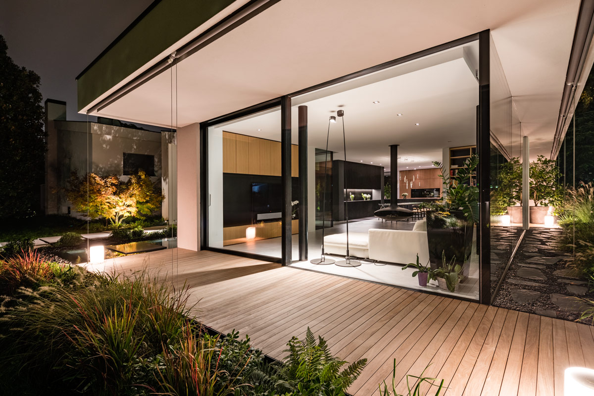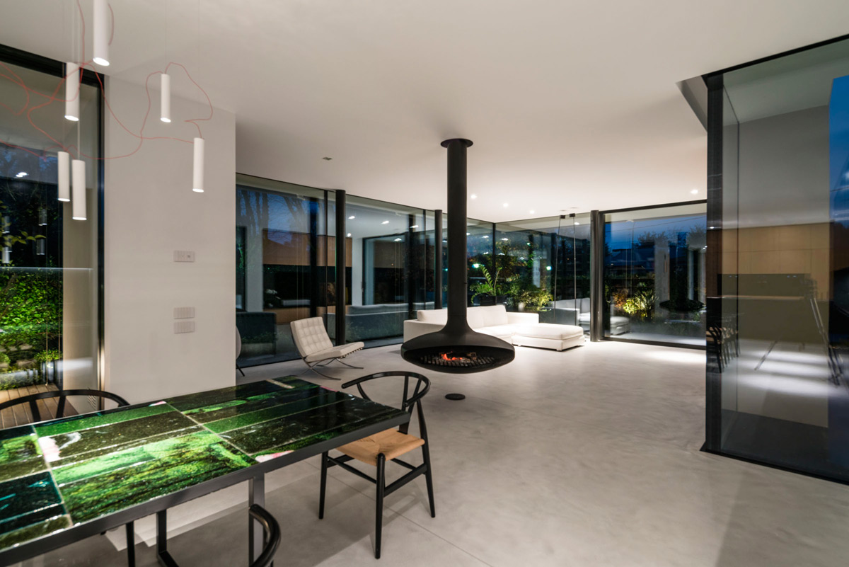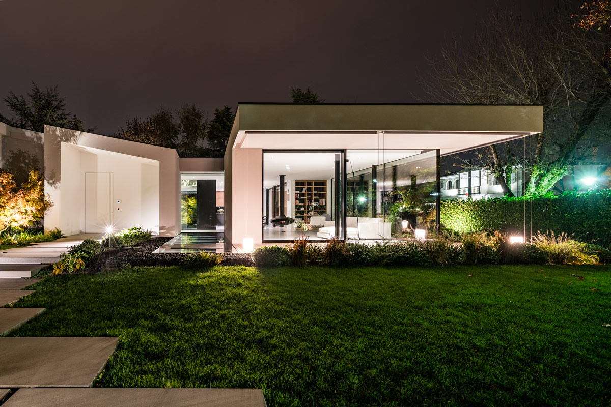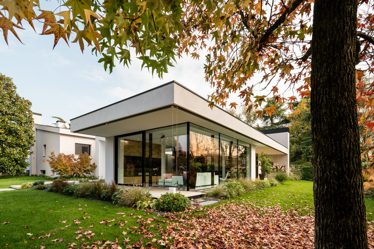 L’abitazione è stata soggetta a una ristrutturazione del piano superiore e all’ampliamento della zona living-cucina. Al piano terra ampie vetrate interne ed esterne portano aria e natura direttamente all’interno degli ambienti famigliari. Per completare quest’opera di simbiosi sono state create delle luminose corti interne vetrate nella zona soggiorno. Ovunque regnano finiture di altissimo livello, colori a contrasto e le migliori tecnologie per il risparmio energetico e la sicurezza.